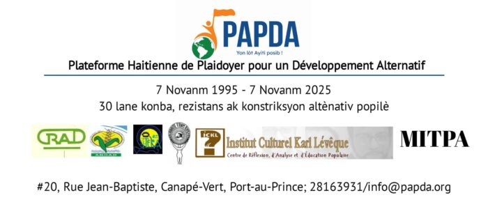 Fondée le 7 novembre 1995, la Plateforme Haïtienne de Plaidoyer pour un Développement Alternatif (PAPDA) est une coalition réunissant des organisations et des réseaux de divers types qui rejettent le diagnostic, les politiques et les recettes épuisées de ceux qui se prennent pour maîtres du monde comme par exemple: le G8, les Institutions Financières Internationales (IFIs), les Entreprises transnationales et leurs nombreux collaborateurs.